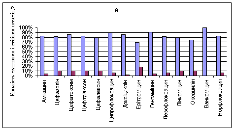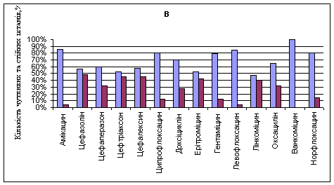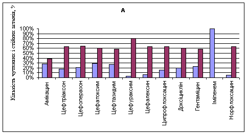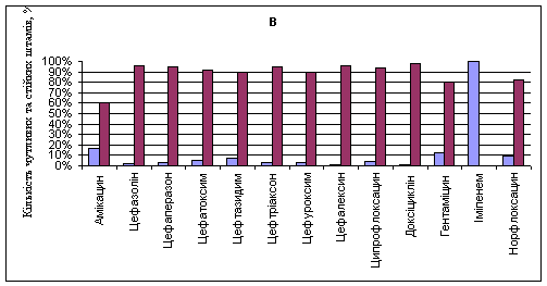 Рис. 1. Чутливість до антибіотиків мікроорганізмів, виділених від пацієнтів урологічного відділення: А – E. coli; В – K. pneumoniae.