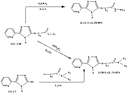 передбачає взаємодію естерів 2-[5-(піридин-2-іл)-4R-1,2,4-тріазол-3-ілтіо]ацетатних кислот (3.27, 3.35) з