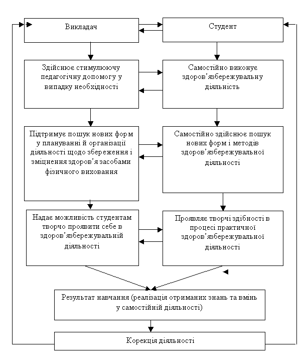 інформаційного і методичного матеріалів із сучасних фізкультурно-оздоровчих методик; участь у підготовці і проведенні спортивних свят з оздоровчою спрямованістю; відвідування кружка „Будь здоровим”; самостійна робота студентів, яка полягала в плануванні і розробці особистих оздоровчих методик, розробці і драматизації занять та виховних заходів на здоров’язбережувальну тематику, підготовці доповідей до міні-конференцій, здійсненні науково-пошукової роботи; створення проблемного наукового кружка, метою діяльності якого була систематизація матеріалу, обговорення методичних питань, розробка методичних рекомендацій для студентів. Взаємодія між викладачами, студентами і представниками керівництва навчального закладу стала більш об’ємною, контактною.