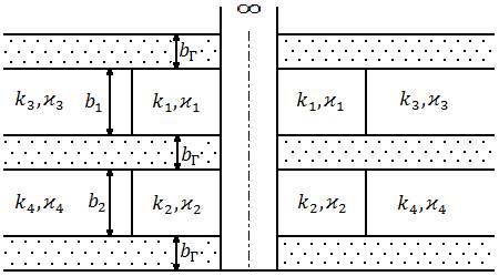 движение жидкости в двух упругих пластах, кровля и подошвы слабопроницаемы. Пласты считаются достаточно