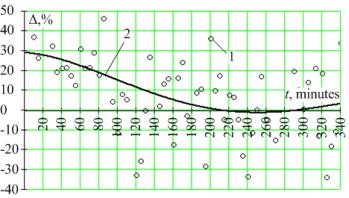 meanings; 2 - approximation of the calculated meanings by a multinomial