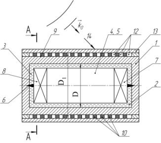 опорах 6 і має датчик кута 7 і датчик моментів 8 для визначення кутової швидкості рухомого об’єкту. Зовнішня поверхня 9 корпуса 1 поплавкового гіроскопа дискретно-неперервно оснащена циліндричними кільцями 10 заданого типорозміру і корпус жорстко установлений у внутрішній повітряній порожнині 12 діаметра D1 теплового кожуху 13 (рис. 2, рис. 3).