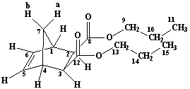 Ди-н-бутил-экзо,экзо-норборнен-2,3-дикарбоксилат ЯМР Н1 СDCl3: 0.92 т. (6H C12, C17, 3J 7.2); 1.3-1.4 м. (4H C11,C16); 1.46 д.т. (1H bC7, 2J 9.2 ); 1.52-1.60 м. (4H C10, C15); 2.12 д. (1H aC7, 2J 9.2); 2.59 д. (2H C2, C3, 2J 2.0); 3.07 ш.с. (2H C1, C4); 3.92-4.12 м. (4H C9, C14); 6.20 с. (2H C5, C6) |