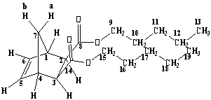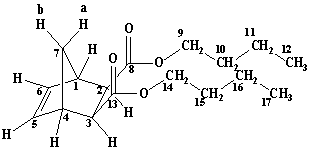 Ди-н-пентил-экзо,экзо-норборнен-2,3-дикарбоксилат ЯМР Н1 СDCl3: 0.86 т. (6H C13, С19, 3J 6.8); 1.2-1,35 м. (8H C11, С12, С17, С18); 1.44 д.т. (1H bC7, 2J 9.2); 1.50-1.63 м. (4H С10, С16); 2.09 д. (1H aC7, 2J 9.2); 2.56 д. (2H С2, С3, 3J 1.6); 3.03 ш.с. (2H С1, С4); 3.88-4.08 м. (4H С9, С15); 6.16 с. (2H С5, С6) |