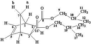 Диизобутил-экзо,экзо-норборнен-2,3-дикарбоксилат ЯМР Н1 СDCl3: 0.91 д. (12H С11, С12, С16, С17, 3J 6.8); 1.48 д.т. (1H bС7, 2J 9.2, 3J 1.6); 1.84-1.95 м. (2H C10, С15); 2.13 д. (1H aС7, 2J 9.2); 2.62 д. (2H С2, С3, 3J 2.0); 3.08 ш.с. (2H С1, С4); 3.71-3.89 м. (4H C9 , С14); 6.20 с. (2H C5, С6) |