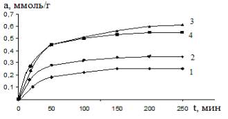 растворов активными углями: 1- АГ-3, 2-АГ-ОВ-1, 3-БАУ, 4 СКД-515