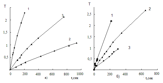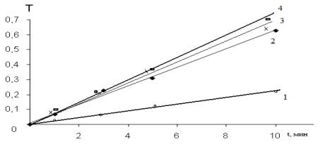 По уравнению T = -ln(1-g) рассчитаны безразмерные кинетические параметры Т и построены зависимости Т от t