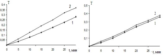 кинетических кривых при одинаковых значениях g. Наличие линейного участка на кривой Т=f(t) свидетельствует о том, что процесс адсорбции