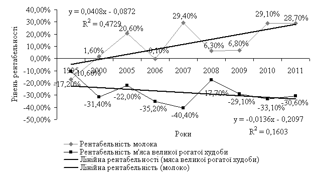 Динаміка рівня рентабельності продукції скотарства в сільськогосподарських