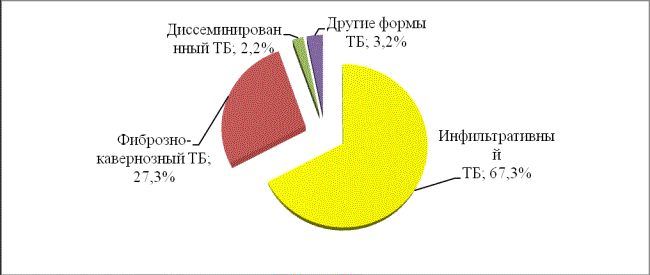 почти четверть - фиброзно-кавернозным туберкулезом - 27,3% (n=137), диссеминированная форма туберкулеза и другие