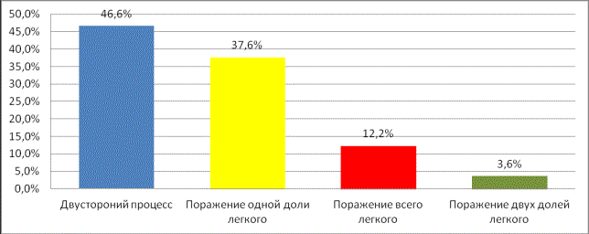 поражение одной доли легкого наблюдалось у 37,6% (n=189), поражение всего легкого наблюдалось12,2% (n=61) и поражение двух долей одного легкого имели 3,6%