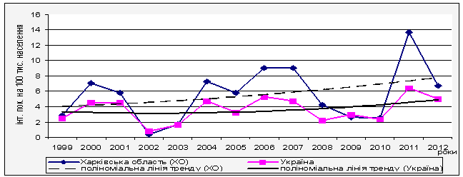 захворюваності на кашлюк у Харківській області та в Україні за 1999-2012 рр.