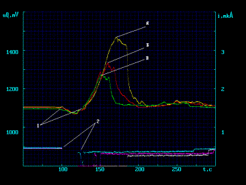 та струму (I, мкA) в часі (t, c) за проходження крові