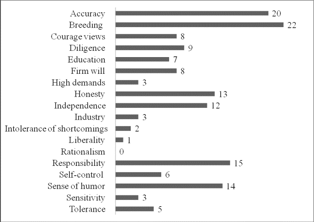 honesty - 13, Independence - 12, diligence - 9, courage and strong will of