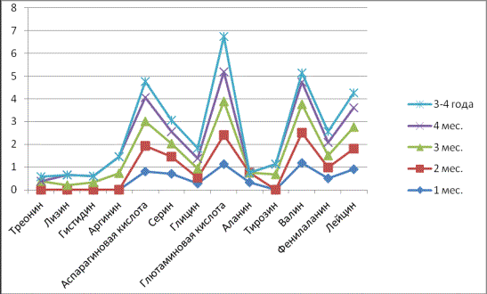 обеспеченностью характерно отсутствие гистидина, лизина в первые два месяца