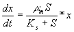 - максимальна швидкість росту біомаси, x- концентрація