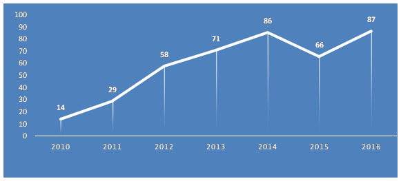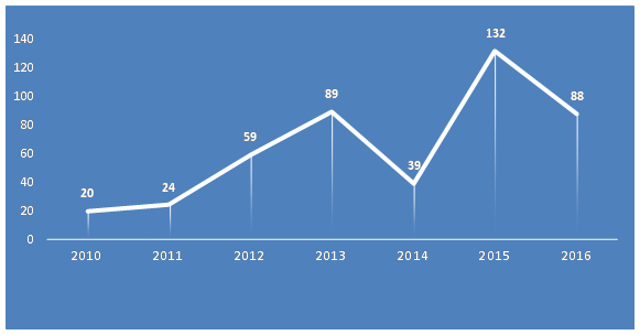 рис.2 відображена кількість укладених інвестиційних угод за період 2010-2016рр.