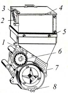 відбивач; 2- пружина; 3- вісь; 4- передня стінка бункера; 5- болт з гайкою; 6- ролик; 7- висіваючий диск;