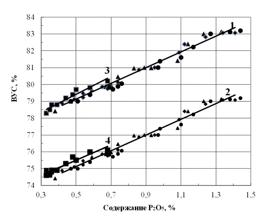 среднем на 4 %. При этом зависимость ВУС от содержания оксида фосфора