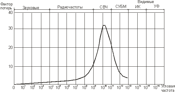 приведена зависимость потерь энергии в воде от частоты электромагнитного поля [2].