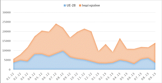 Динаміка імпорту свинини в Україну за 2012-2013 рр., т