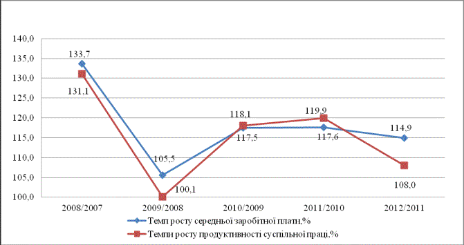Як свідчать дані рис. 1, останніми роками в Україні ситуація відбулися певні деструктивні зміни у системі матеріального стимулювання праці. Так, якщо в 2009 році темпи росту заробітної плати перевищували темпи росту продуктивності суспільної праці на 5,4%, тобто діюча система оплати праці не стимулює зростання її продуктивності, незважаючи на випереджувальний ріст заробітної плати у 2010 - 2011 рр. над темпами росту продуктивності суспільної праці (на 0,6% та 2,5% відповідно). Однак, вже в 2012 році ріст заробітної плати перевищував ріст продуктивності суспільної праці на 6,9%, що свідчить про зниження ефективності системи матеріального стимулювання праці працівників.