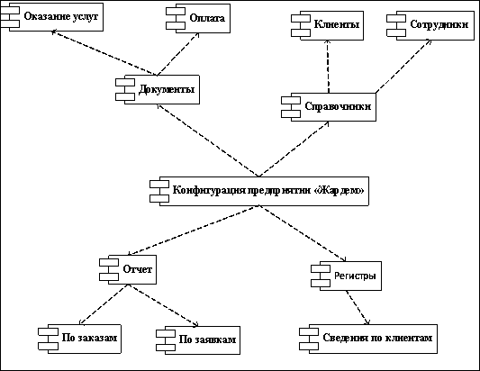 компоненты, интерфейсы и отношения зависимости и реализации [2].