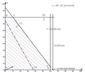 чувствительность оптимального решения задачи о производстве радиоприемников. Область допустимых решений задачи (см. рисунок 2) – многоугольник ABCDE. В оптимальной точке D пересекаются прямые (1) и (2). Поэтому ограничения