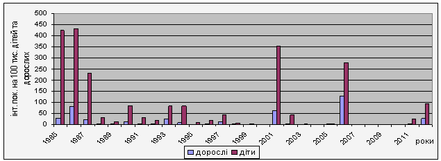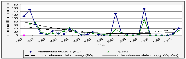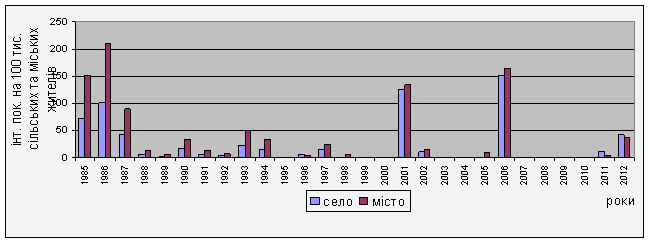 1985-1986 рр., 2001 р. та у 2006 р., причому рівень захворюваності в області в