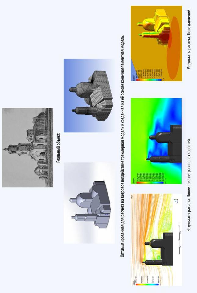 В ходе решения поставленной задачи можно выделить следующий порядок действий: создание упрощенной объемной модели, оптимизированной для аэродинамических расчетов. Она создана на основе обработанного облака точек, полученного методами лазерного 3D сканирования. Проводить сканирование не ставилось целью настоящей статьи, поэтому в работе были использованы материалы дипломного проекта 2013 года студентов кафедры строительной механики Гречишкина М. В. и Мостинца А. С. [4] Далее выполнялся импорт в ANSYS. После этого проводилось создание конечноэлементной модели с двумя типами сеток. Следующим шагом задавались граничные условия и три модели турбулентности. Затем запускалось вычисление.