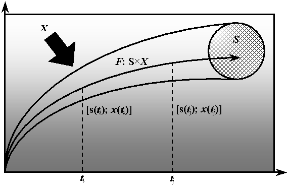 компонентами его вектора, а также вектора внешних воздействий при "t Î T. Рис.1 иллюстрирует изложенное графически.