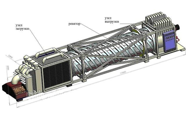 Под воздействием высокой температуры разлагаются токсичные вещества. Оставшиеся в выхлопных газах вредные соединения разрушаются на каталитическом преобразователе. Горячий выхлопной газ поступает во внешнюю биметаллическую сотовую оболочку реактора для разогрева его активной зоны. Углеродная составляющая твердого остатка преобразуется в синтез-газ.