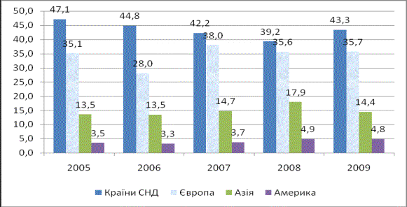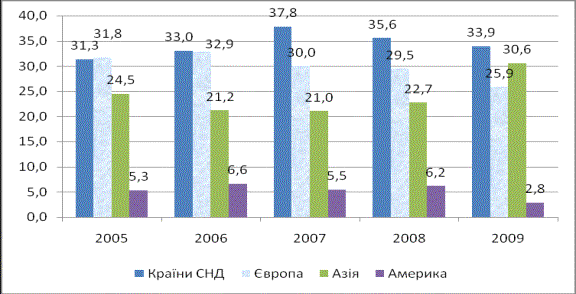 Рис.1 Частка країн СНД, Європи, Азії та Америки в