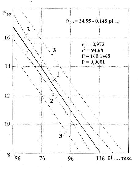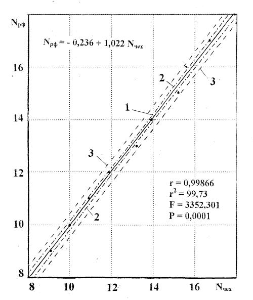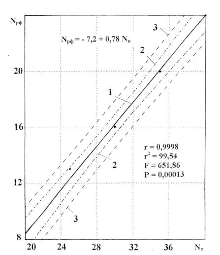 1- линия регрессии; 2-95% доверительный интервал для оценки точности и надежности прогноза среднеожидаемых значений Nрф для заданных значений Nп; 3-95% доверительный интервал для оценки точности и надежности среднеожидаемых значений Nрф для возможных значений Nрф; r-коэффициент корреляции; r2- коэффициент детерминации; F-критерий Фишера; р-уровень значимости.
