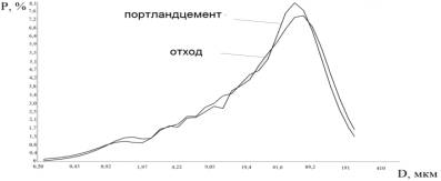 что области распределения частиц отходов обогащения и цемента близки. При этом