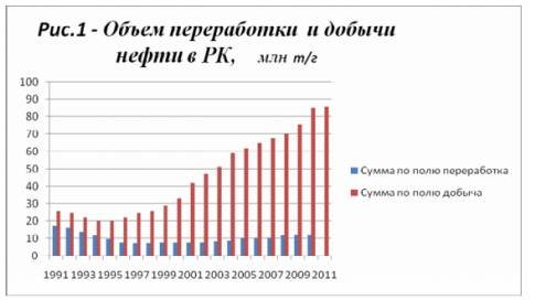 изменения объема добычи и переработки нефти за последние 20 лет в РК показана ниже