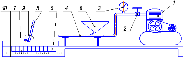 емкость для зерна, 7 – линейка, 8 – бункер, 9 – транспортир, 10 – рама.