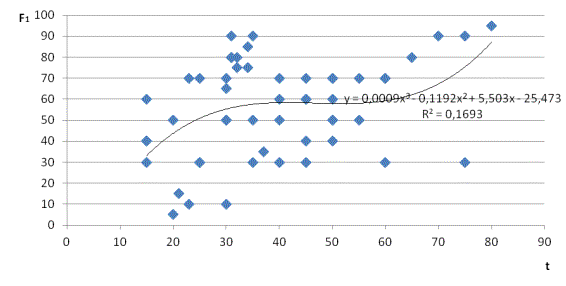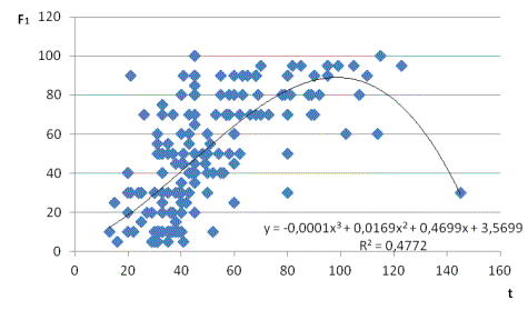 Рис. 1 – Влияние фактора средний уровень загрузки улично-дорожной сети (F1) на время передвижения по необходимому маршруту на общественном транспорте