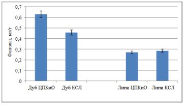 Рис.1. Содержание фенольных соединений в листьях дуба и липы