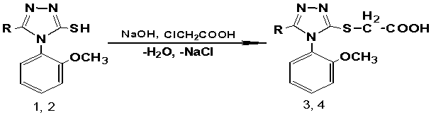 Алкілування 5-метил-4-(2-метоксифеніл)-4Н-1,2,4-тріазол-3-тіону та 5-феніл-4-(2-метоксифеніл)-4Н-1,2,4-тріазол-3-тіону ми проводили при нагріванні вихідних тіонів з кислотою хлорацетатною в