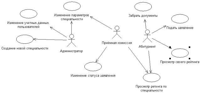 данной системы; добавление новых заявлений; просмотр положения абитуриента в рейтинге по специальностям; просмотр списка по специальности; подтверждение приёма документов; составление списка «волн»; изменение