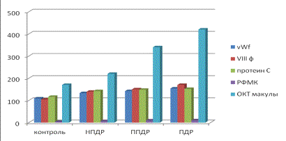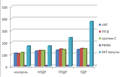 Уменьшение значений некоторых показателей гемостаза и эндотелиальной дисфункции (vWf , фактора VIII, АПС, РФМК) по стадиям ДР характеризует снижение тромбогенной активности в микроциркуляторном русле и снижение проницаемости мелких сосудов сетчатки, что приводит к разрешению ДМО.