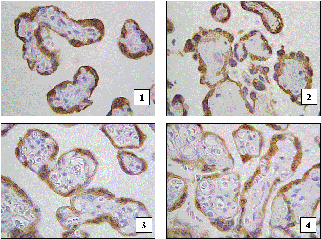 Матеріал і методи. Для вивчення концентрації плацентарного лактогену у синцитіотрофобласті хоріальних ворсин екстрахоріальних плацент використано імуногістохімічну методику з первинними антитілами проти плацентарного лактогену. Місця специфічного зв’язування первинних антитіл з гормоном фіксували за допомогою стрептавідин-біотинової системи візуалізації LSAB2 з пероксидазною міткою і відповідного до цього барвника – діамінобензидину. Інтенсивність вказаного забарвлення оцінювали комп’ютерно-мікроденситометричним методом (визначали оптичну густину місць специфічного забарвлення у відносних одиницях) на цифрових копіях оптичних зображень хоріальних ворсин. За інтенсивністю забарвлення судили про концентрацію плацентарного лактогену. Групи дослідження склали спостереження з фізіологічною вагітністю: плацент звичайної форми – 18, екстрахоріальних – 35; з ХПН, обумовленою незрілістю хоріального дерева: плацент звичайної форми – 17, екстрахоріальних – 40. Розбіжності між групами дослідження здійснювали згідно методу Стьюдента (непарний двобічний критерій Стьюдента).