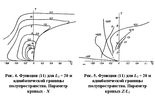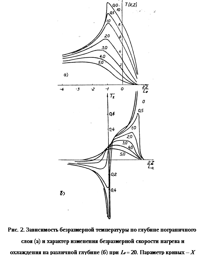 Типичные зависимости (11) для случая отсутствия теплообмена с границы поверхностного слоя представлены на рис. 4. Для того, чтобы наглядно проследить развитие теплового процесса в поверхностном слое, можно построить зависимость для каждой точки полупространства (рис. 5).
