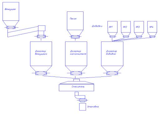 Рассмотрим типовую схему получения сухой строительной смеси без сушильного