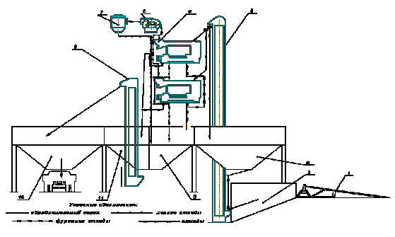 6- бункер резерва; 7- циклон; 8- вентилятор; 9- нория 2НПЗ-20; 10- бункер