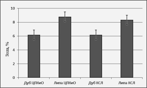 Рис 1. Содержание золы в листьях дуба и липы в КСЛ и