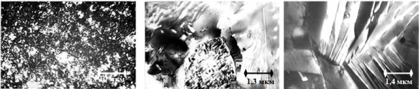 Рис. 4. Микроструктура предварительно закаленного от 12500С, 1 мин. сплава после старения: а - 10000С, 0,1 ч., х10000; б - 11000С, 0,5 ч., х450; в - 11000С, 1 ч., х8000