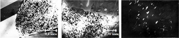 Распад внутри глобулярных частиц α–фазы приводит к формированию структуры слоистой формы, при этом размеры частиц увеличиваются по сравнению с распадом при 7000С. Особенно отчетливо это заметно на темнопольном снимке в рефлексах α–фазы, приведенном на рис. 1, в.