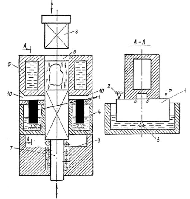 2 и 3, нагружают внешней механической нагрузкой Р, помещают в ванну 4 с охлаждающей средой и нагревают исследуемую